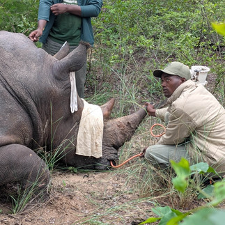Darting, sedating and treating a rhino is not an easy task - especially in wooded or flooded areas. The tranquilizer takes about 8 minutes to kick in, and a rhino can walk or even run far in 8 minutes, without us knowing where he will eventually go down. This requires a whole team to make sure the animal doesn't fall and injure himself and to help "push" him into a comfortable, and convenient, position. From then on, a top priority is to keep an eye on his vitals - keep him cool with spray water, oxygenate him and monitor his temperature and respiration. Dr Foggin and his team of assistants, including National Parks, then swiftly treated Thuza's right eye first, the one that seems the most badly affected, before attending to the left eye. It was also important to take samples of the eye "goo" so that we can test it and really see what is going on. We also make the most of the rhino being immobilised to take a tiny DNA ear sample for our records.